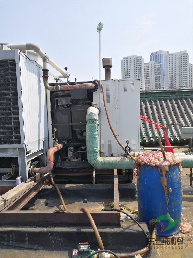 2. 根據廠家說明書將藥劑按照比例配比稀釋后注入系統軟水旁路中循環沖洗,在系統中流動30分鐘左右以排除系統的臟東西且不損傷銅管(如沒有特殊情況不要隨意改變濃度)。對于較嚴重的機組可適當增加處理時間或加入適量緩蝕阻垢劑減少對管道的壓力負擔 。 注意:根據現場實際情況控制藥液溫度以及加藥的順序以免發生意外事故!一般建議由人員操作!